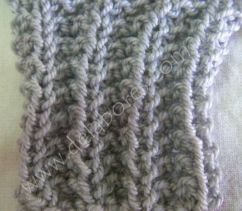 1° giro: 1PD *filo, fai passare un punto senza finirlo nel ferro destro ma prendilo come se lo facessi al rovescio, 2 punti insieme * Finisci con 1R.