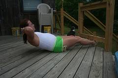 - Con la schiena sul pavimento, gambe a 90º gradi elevate dal pavimento, mani dietro la testa, gomiti aperti. Piegare il tronco alzando i gomiti del pavimento mentre si espirare, tornare ispirando.